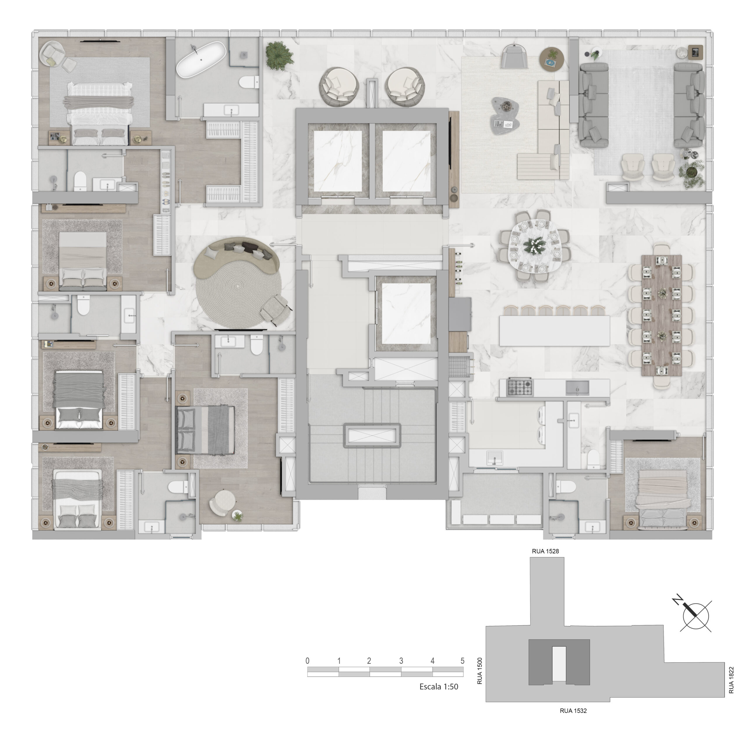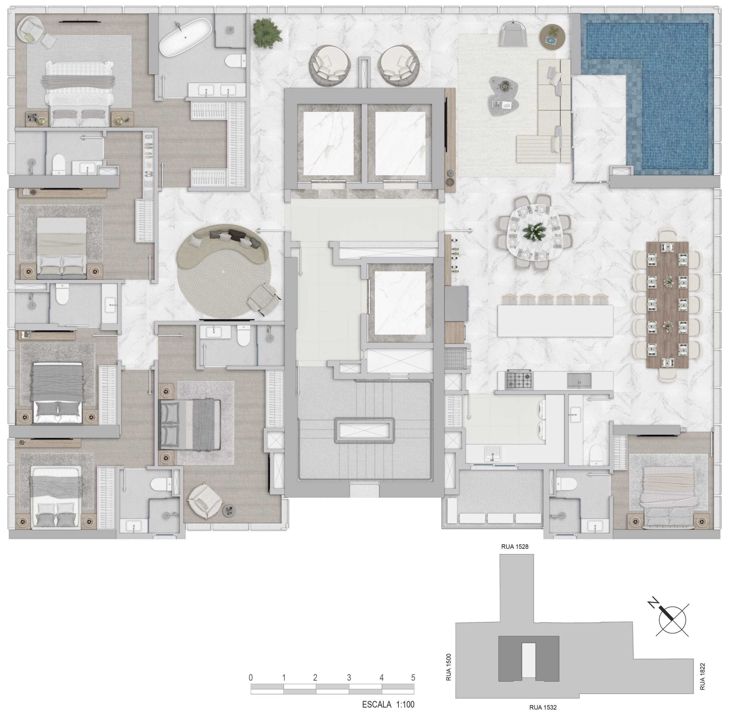 Ideal para momentos de descanso, estudo ou lazer, os dormitórios oferecem espaço para mobiliário variado, como camas king size, áreas de trabalho e armários planejados. Com uma atmosfera tranquila, cada quarto se torna um refúgio perfeito para relaxar após um dia agitado.